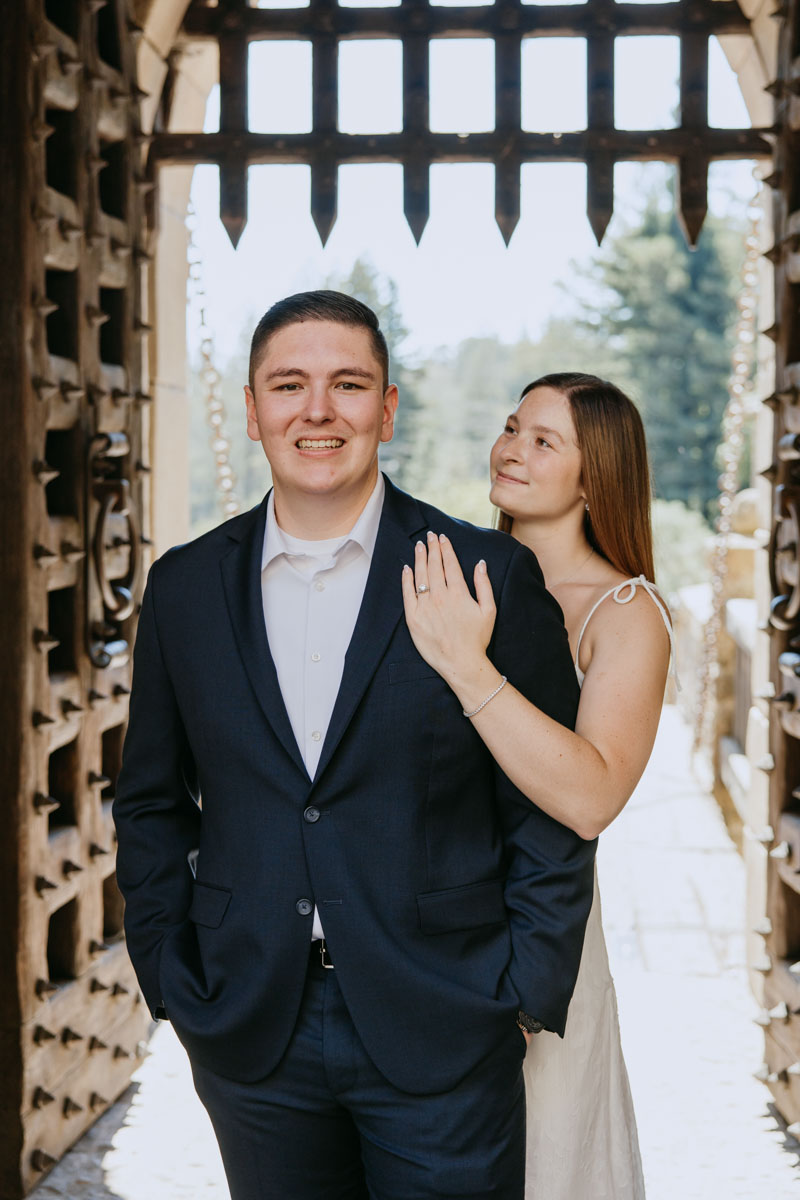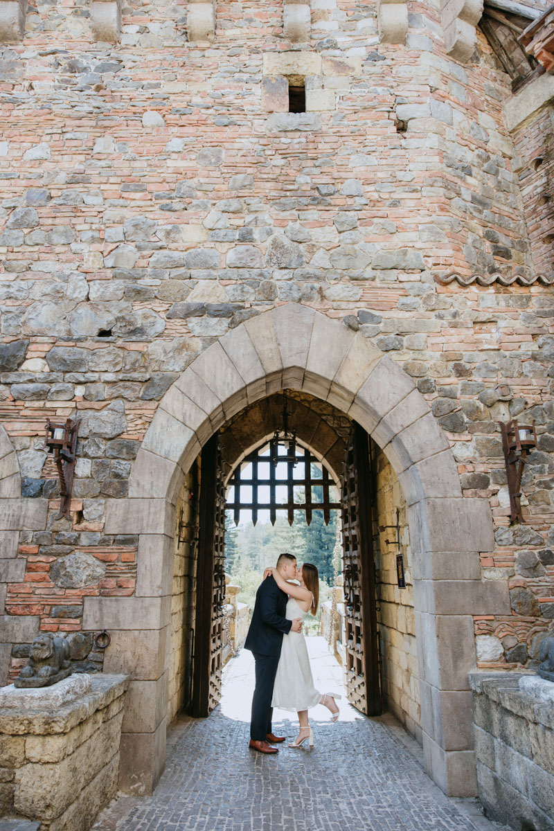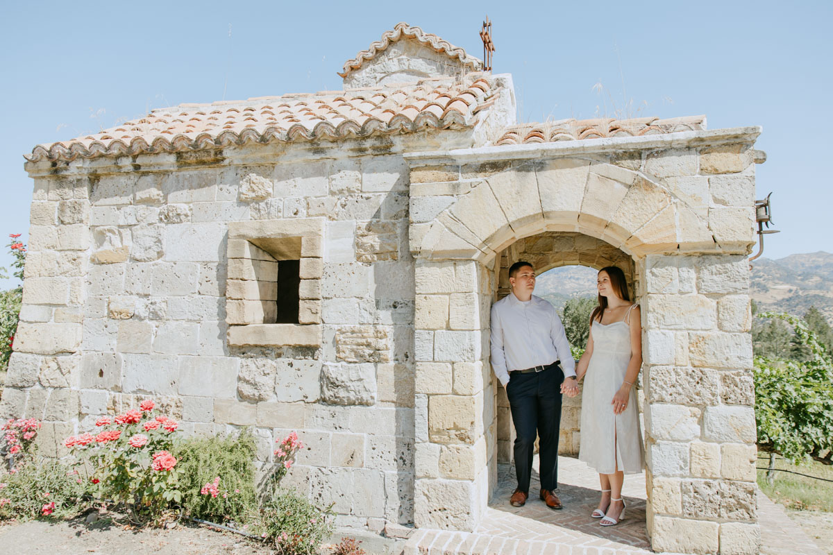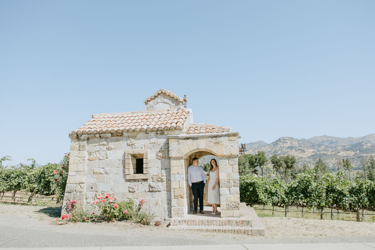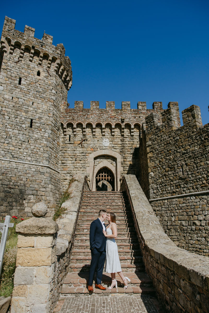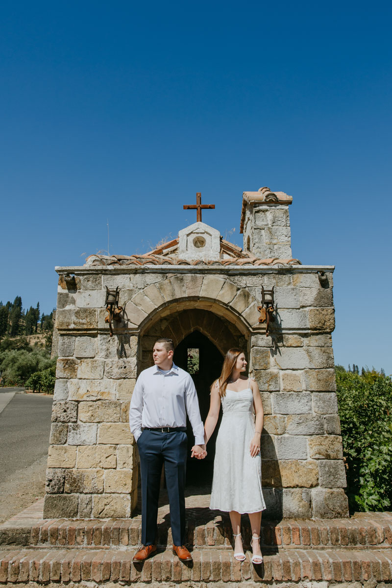 If you’ve ever wanted to take photos at a beautiful medieval castle (followed by some delicious local wines) without leaving California, Castello Di Amorosa in Napa Valley is the perfect spot. Erika and Billy chose this regal setting for their engagement photos, dressed like royalty, and explored the vineyards in the June sun. The vines, the castle towers, doors, and drawbridge, and a little chapel beside the road gave us a variety of backdrops and the vast space ensured that we could enjoy our time away from any crowds despite it being a popular tourist attraction. Best wishes for this darling couple and the fairytale that awaits them!