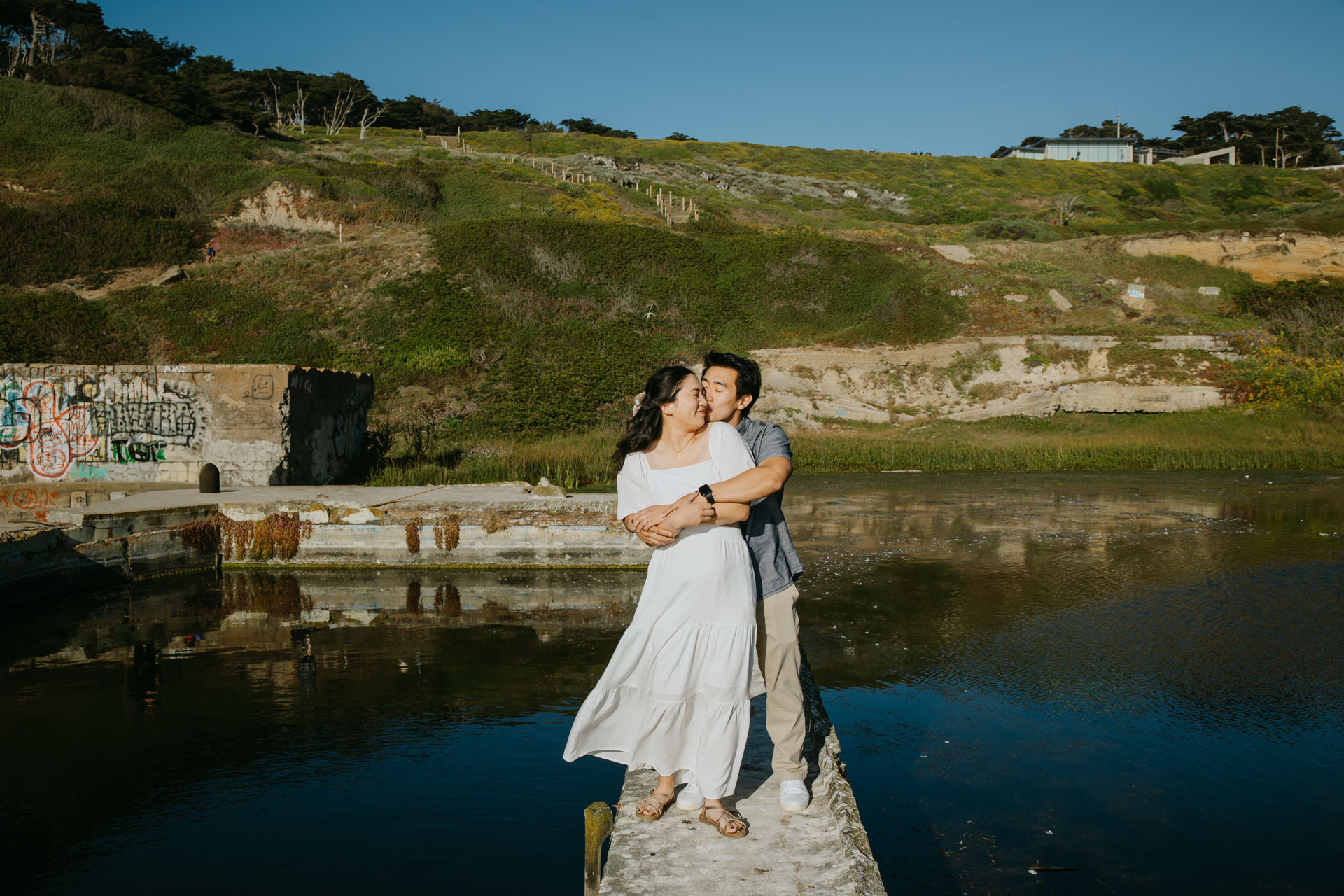 The Sutro Baths at Lands End is a gem of a spot, despite it being extremely windy almost every time I’ve been there. But the stars aligned for my session here with Stephanie and Michael – the weather was perfect for photos that day, and the sky was clear and blue! We walked along the concrete paths over the pools to catch some photos with the reflections on the water. Then we wandered down to the beach, and finally made the mini hike to the tree-lined trail just in time for it to be bathed in golden light. It was such a joy to see this couple’s personalities come out as we took photos against these stunning backdrops, and I can’t wait for their wedding next year!