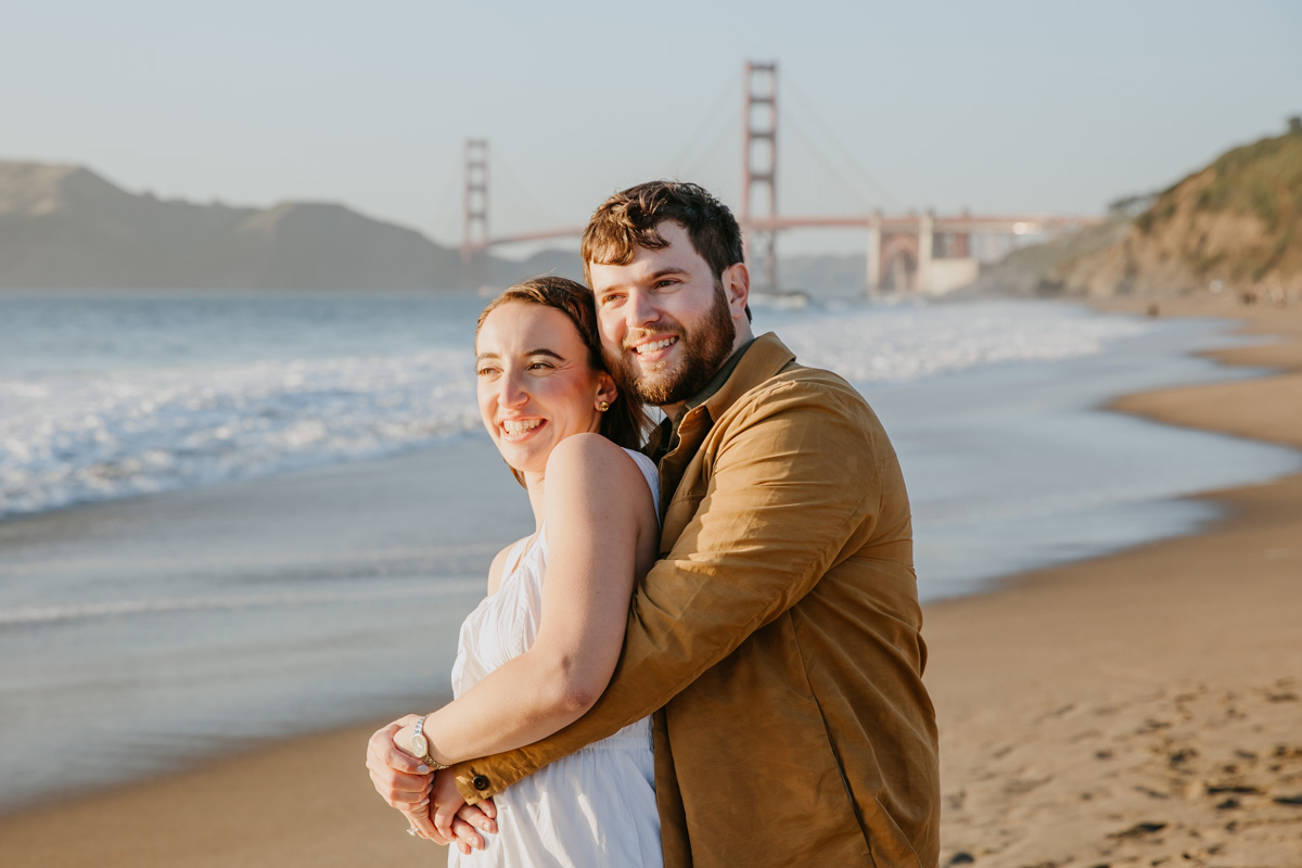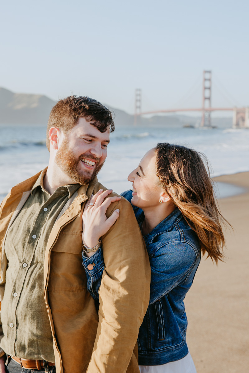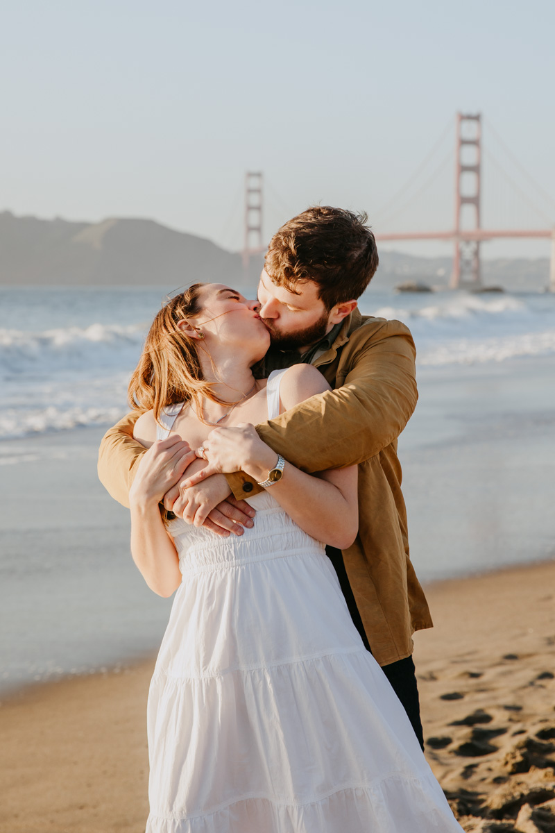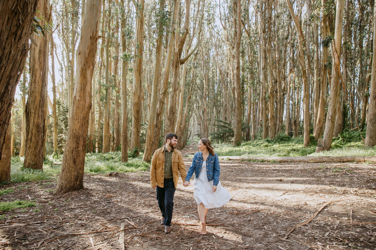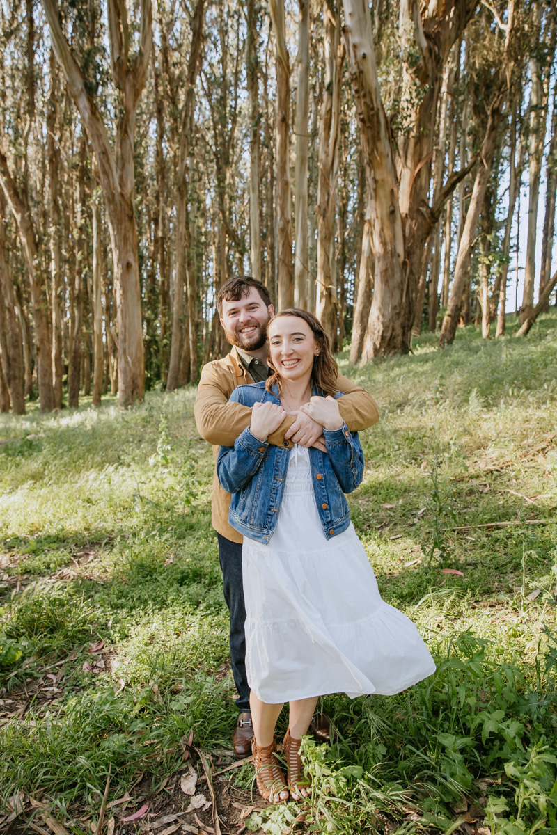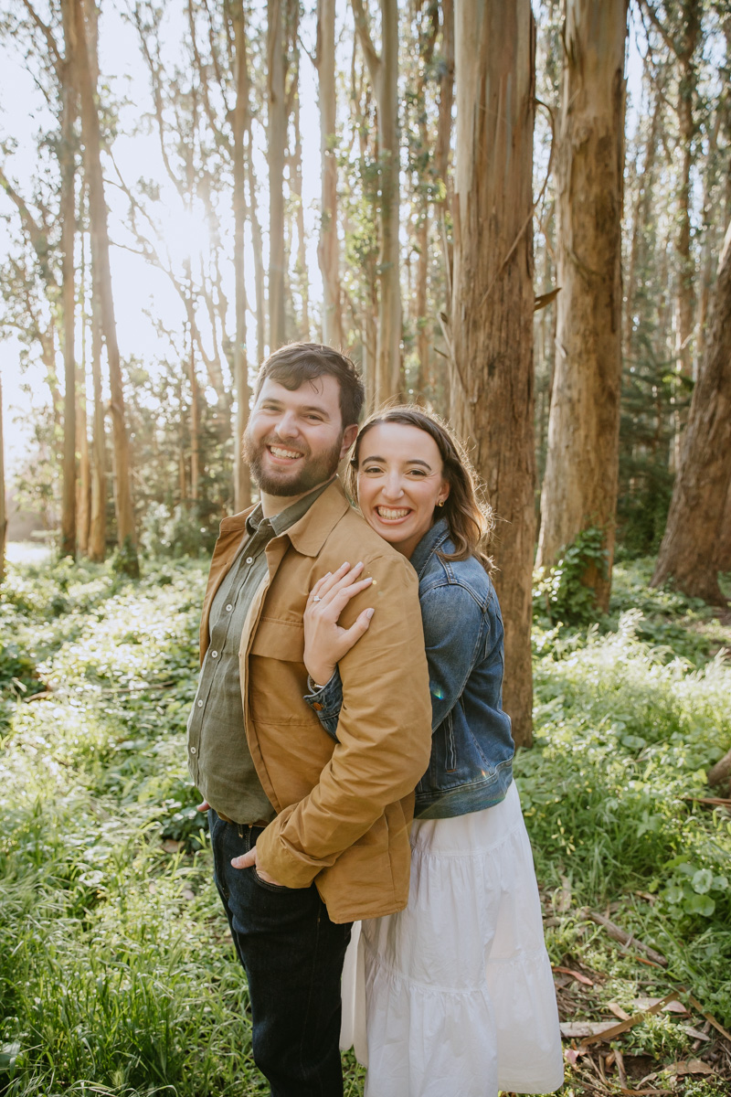 For Rosie and Matt’s engagement photo session, they wanted the best of two worlds: the moody, woody vibes of Lovers Lane, and the sunny coastal view of the Golden Gate bridge at Baker Beach. The sun coming through the trees at Lovers Lane gave us such beautiful lighting illuminating this glowing couple, and the sun at the beach gave us bright blue skies and water.