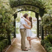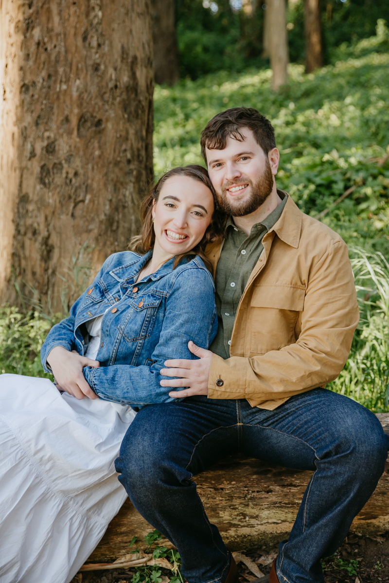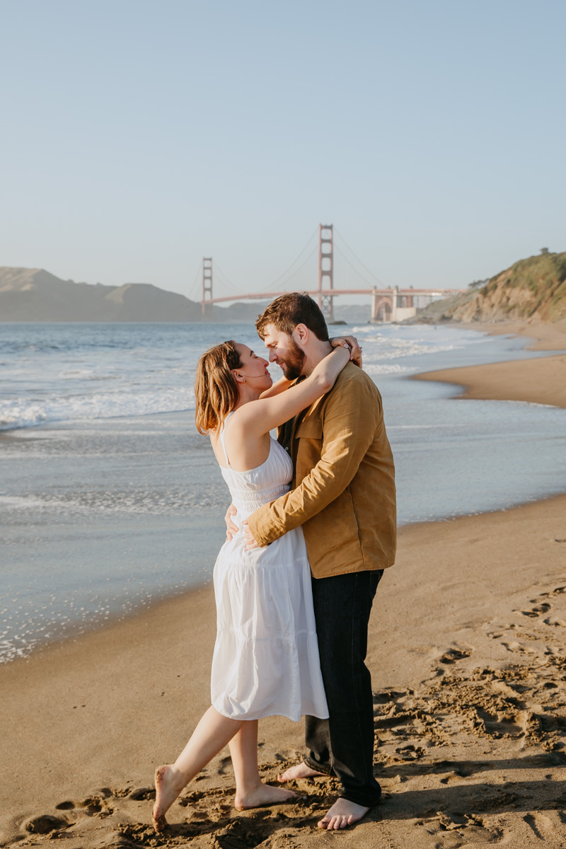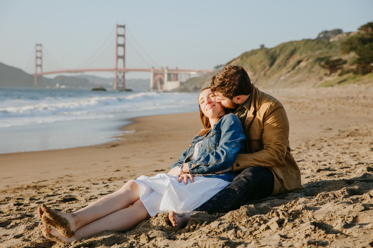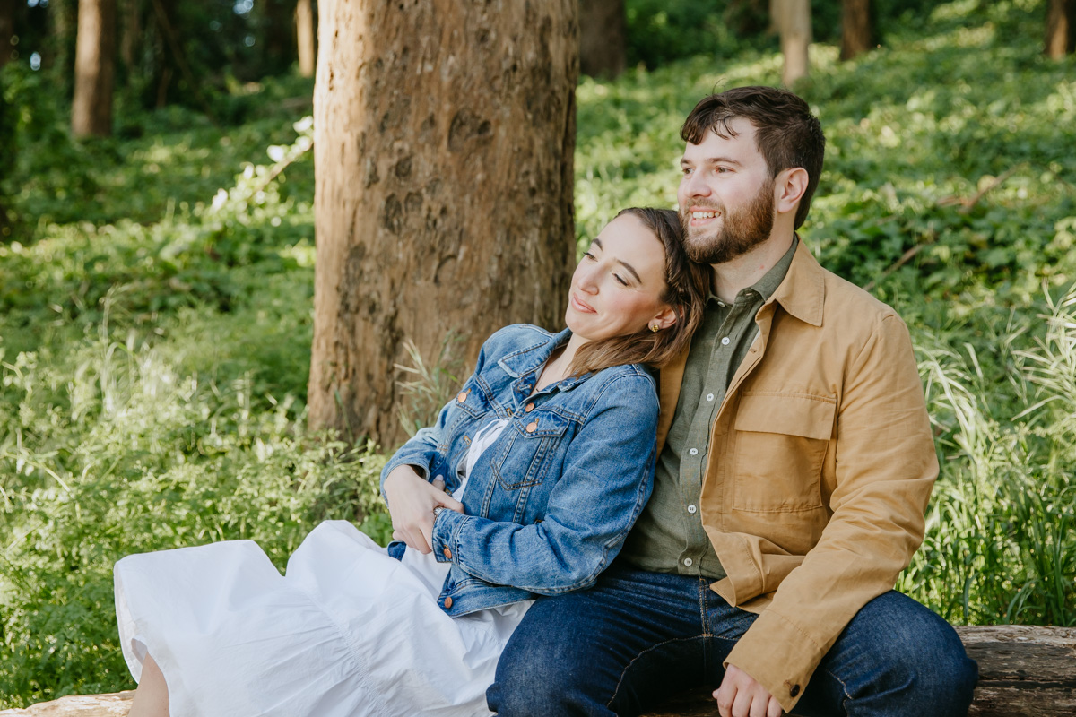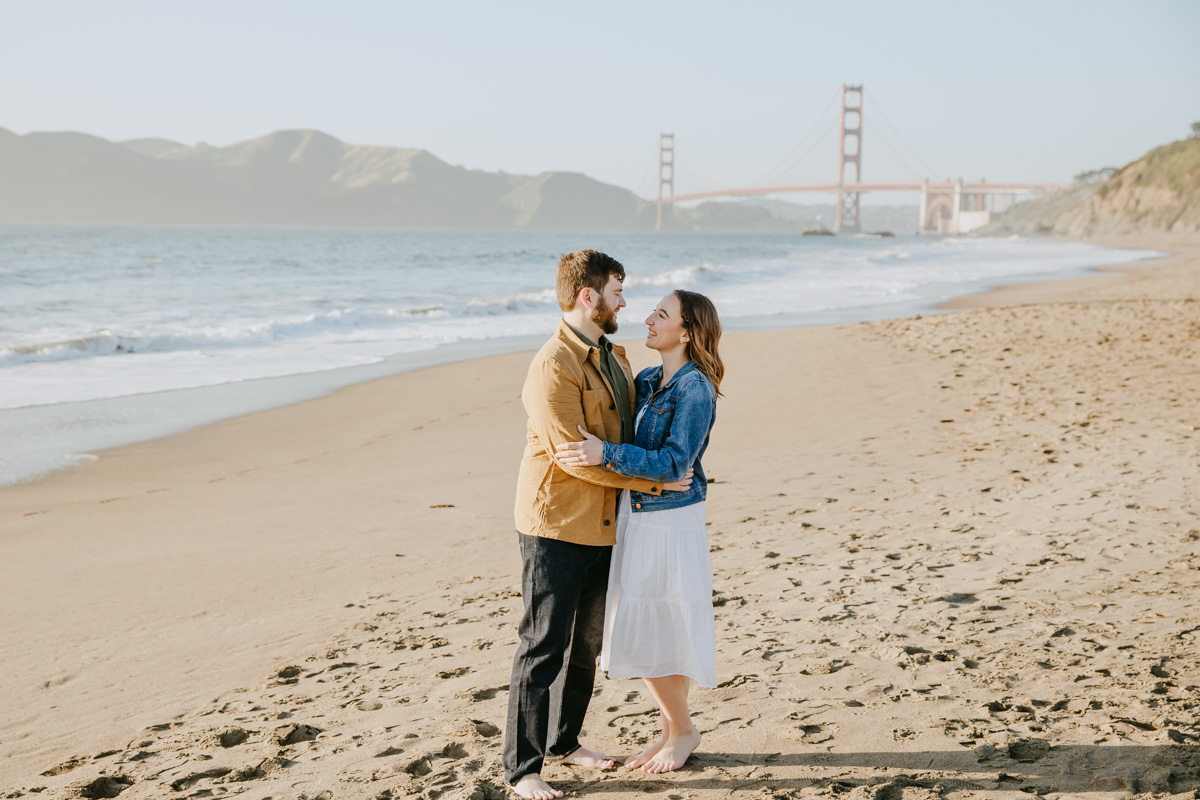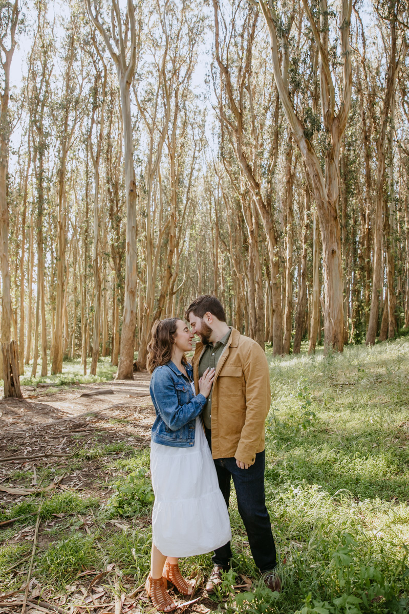 For Rosie and Matt’s engagement photo session, they wanted the best of two worlds: the moody, woody vibes of Lovers Lane, and the sunny coastal view of the Golden Gate bridge at Baker Beach. The sun coming through the trees at Lovers Lane gave us such beautiful lighting illuminating this glowing couple, and the sun at the beach gave us bright blue skies and water.
